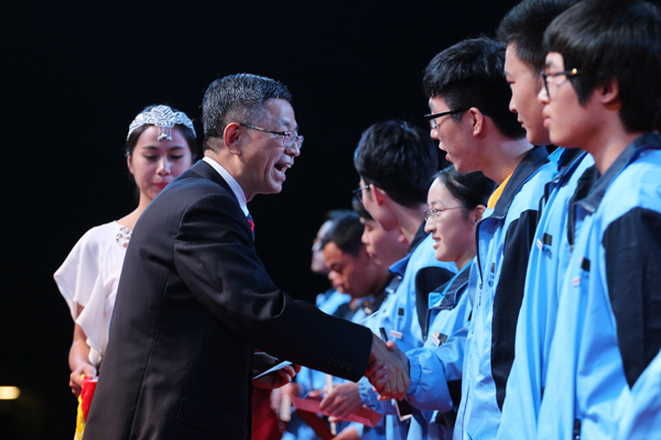 公司党委书记王建华为获得新生奖学金的同学颁奖。