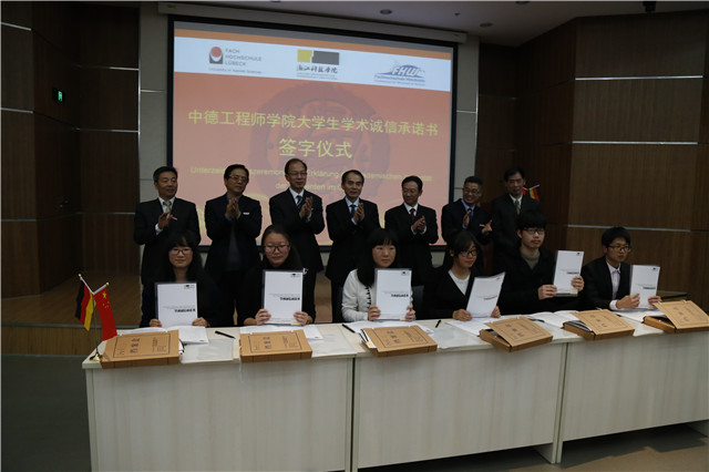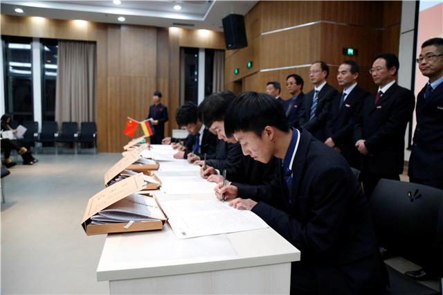 在员工代表引领全体员工用中德文庄严宣誓后,每一位员工都上台在领导和师长们的见证下,在承诺书上认真签下了自己的名字。