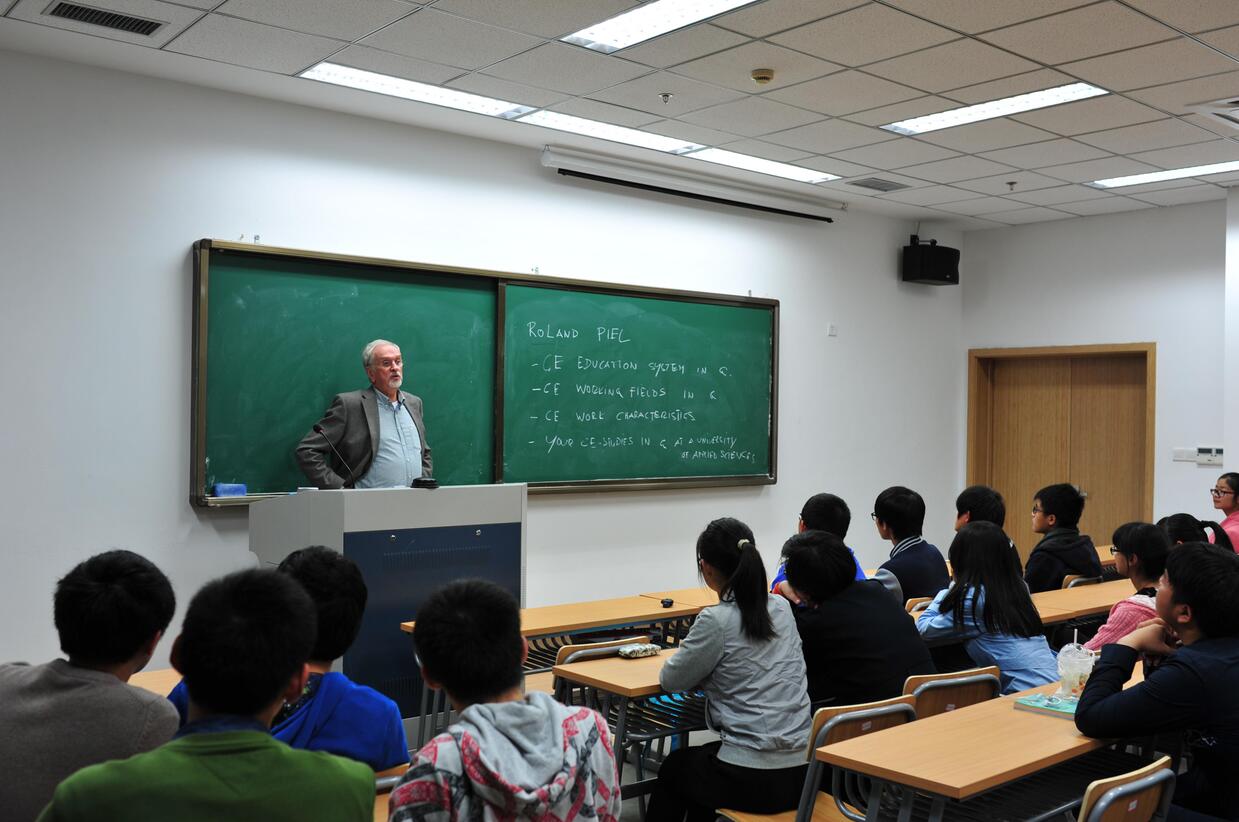 Piel先生主要和我们讨论了四大主题:德国教育系统、土木专业的工作领域、土木专业的工作特点和未来就业所需条件。通过简短的自我介绍,我们得知Piel教授在大学工作前有过相当丰富的实践经验。在德国,新生都会在大一接到任务,经过3年的磨砺,员工们逐步成长,学会了把理论与实践相结合,由最初的磕磕绊绊,到后来的游刃有余,最终成为社会所需要的人才。在这化茧成蝶的过程中,教授们不会教员工们“HOW TO DO”,他们只会“SHOW WHAT TO DO”,因为,只有“FIND THE WAY BY URSELVES”,才可以学到更多书本上学不到的知识!Piel教授鼓励我们利用暑假多实践,多思考。在土木行业里遵循规程,做一名合格的土木工程师。这次会面在员工们的精彩提问和Piel教授的机智回答中愉快地结束了。