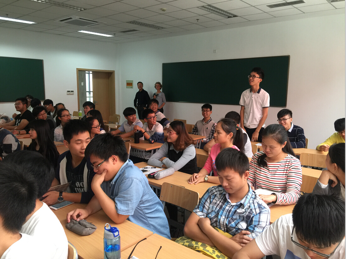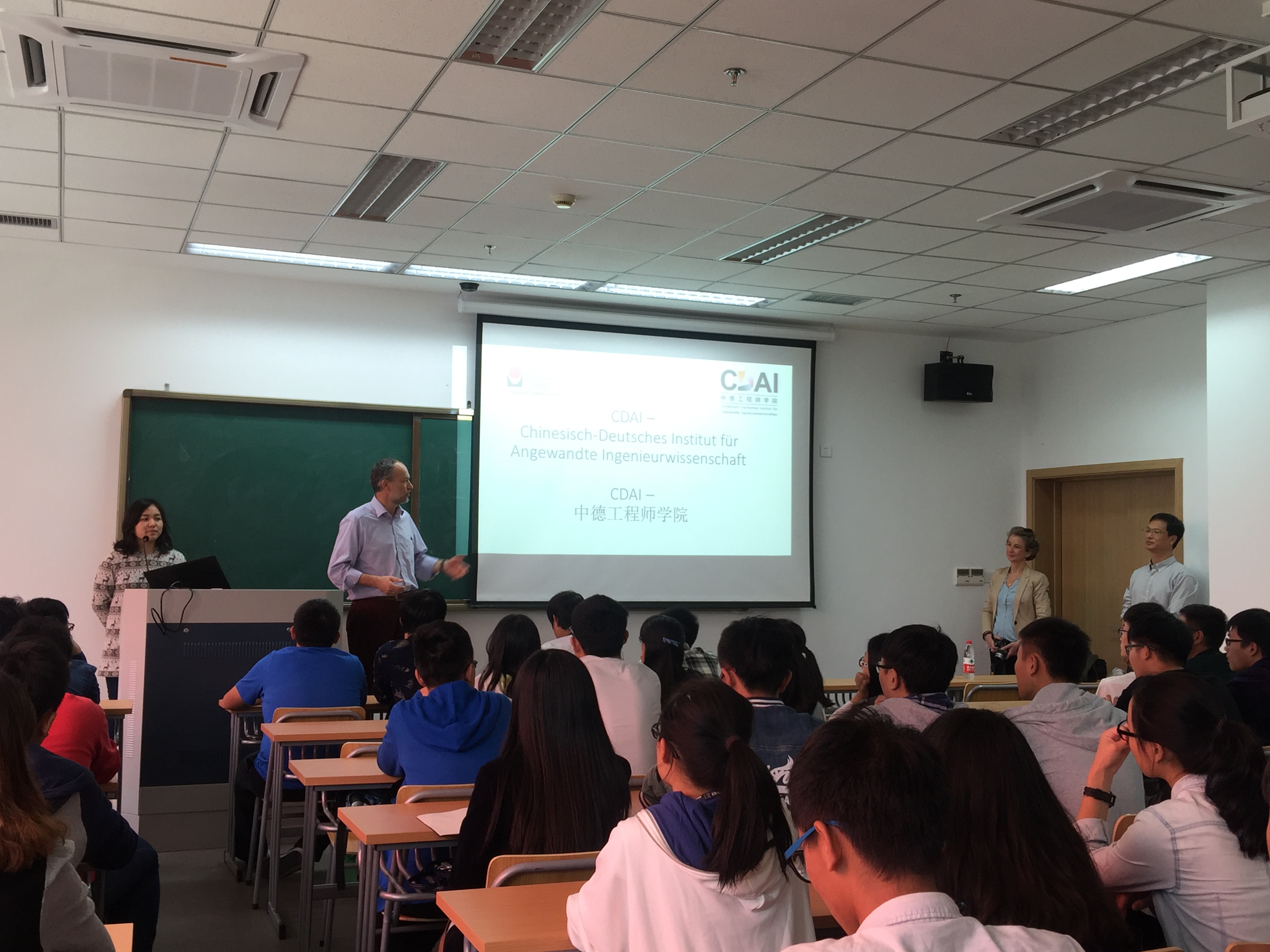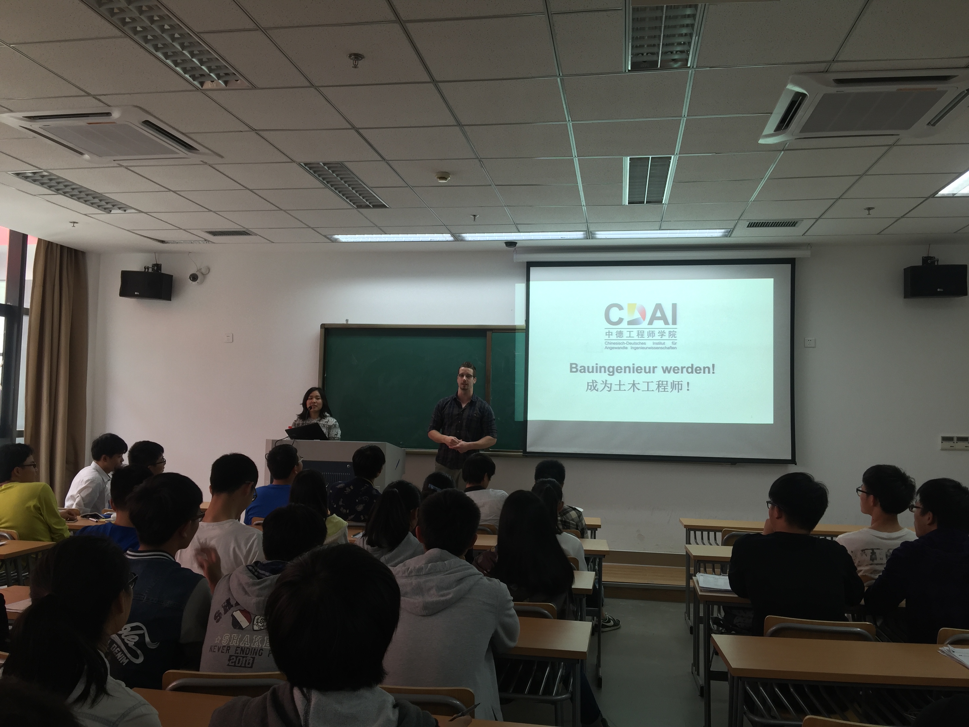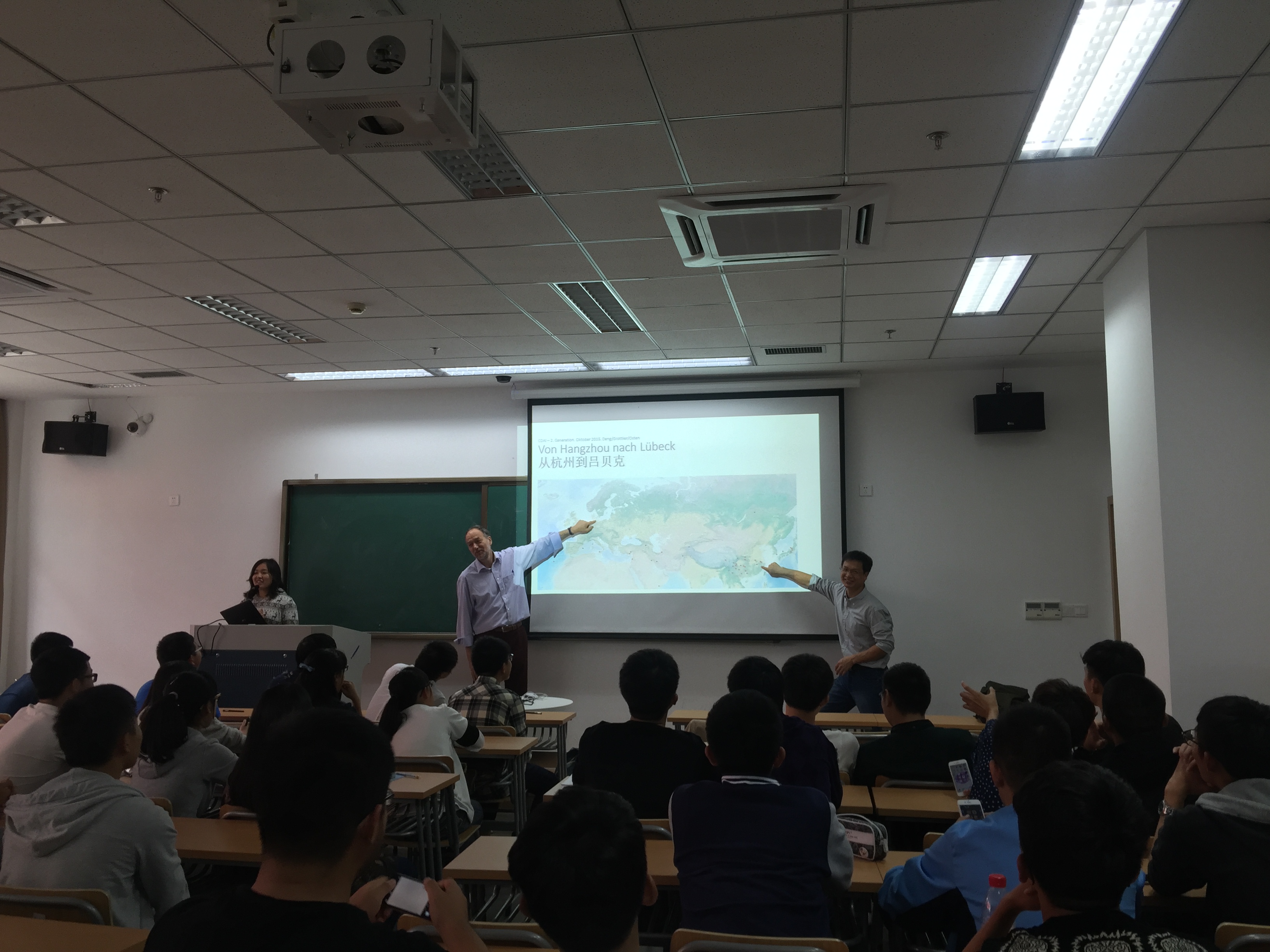 10月20日,来自德国合作院校吕贝克应用科技大学(FHL)的土木工程专业负责人Prof.Grottker和项目工程师Jan  Osten 先生、Nikola女士、邓鸿羽女士以及五位来自德国的交流生来到公司安吉校区,并与土木工程专业的60余名新生进行了见面交流。