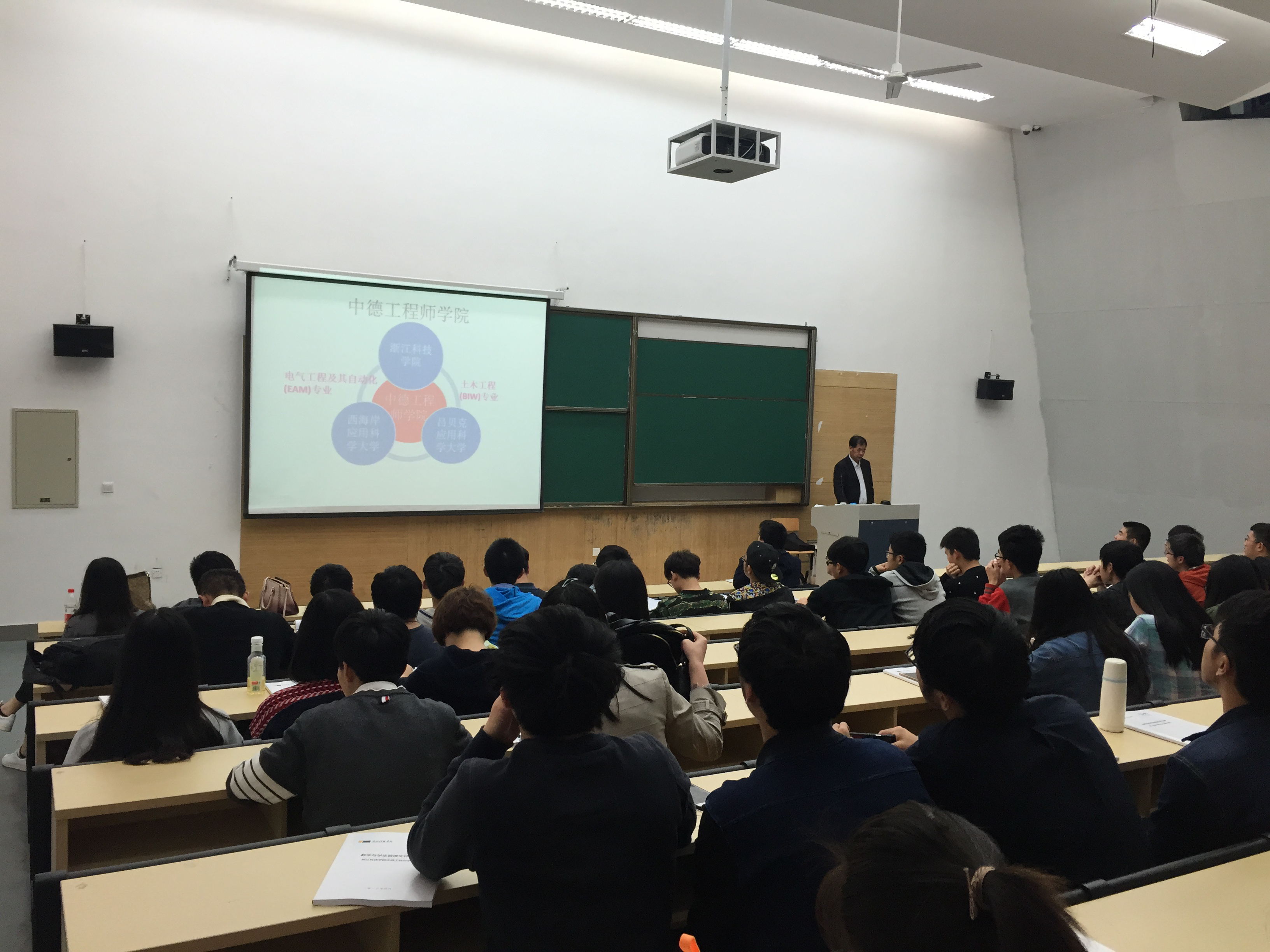 徐理勤经理详细介绍了预实习、实习项目的条例和出国选拔的程序,并着重强调了获得中德双方学士学位的注意事项。在介绍交流奖学金时,徐经理鼓励同学们积极参与暑期赴德交流夏令营活动,开拓眼界,学习专业知识,为今后的学习工作打下坚实基础。