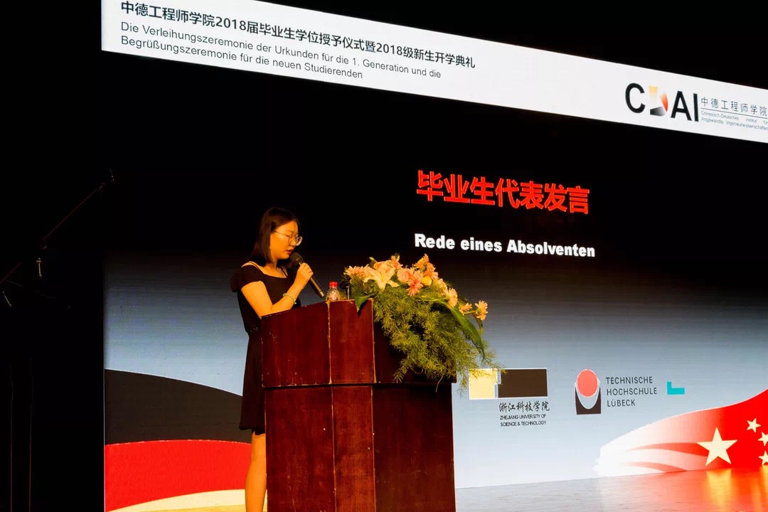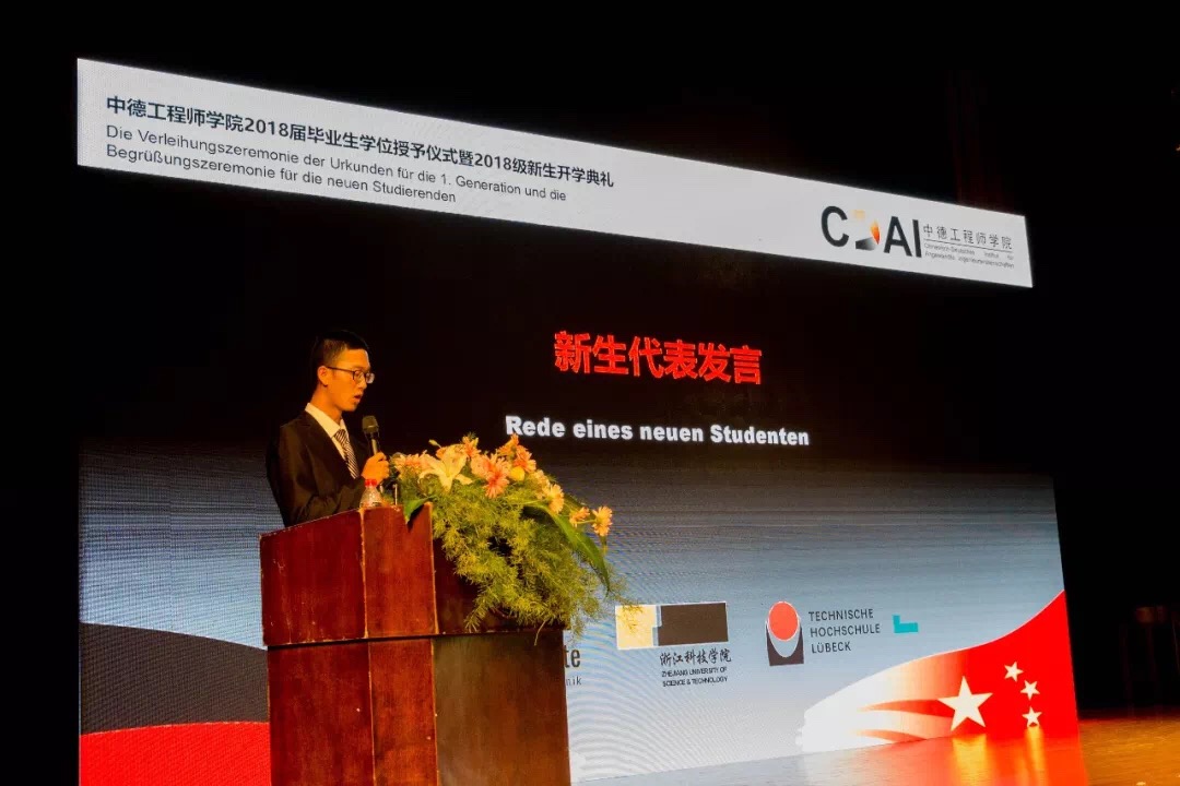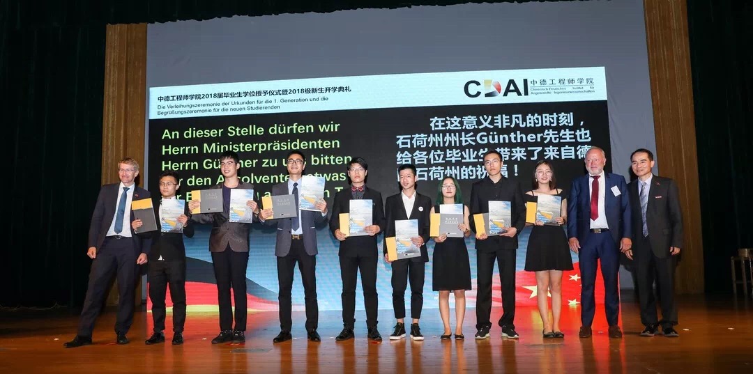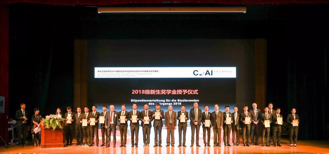 欢迎仪式结束后举行了公司2018届部分毕业生学位授予仪式及2018级新生开学典礼,活动由公司经理徐理勤、教学经理弗郎克•肯普(Frank Kemper)共同主持,参加活动的还有公司中德双方教师、全体18级新生、部分14级同学及家长。董事长叶高翔与西海岸应用科技大学工程公司经理德特勒夫•廷森(Detlef Jensen)向公司18届部分毕业生颁发中德双学位证书,同时君特先生为毕业生佩戴徽章并赠送礼物。党委副书记赵东福宣读获得2018级新生奖学金名单,中德双方领导为获奖者颁奖。14级员工代表邵依晨、18级员工代表李文纪分别上台发言,畅谈感悟、展望未来,经理徐理勤、教学经理肯普鼓励同学们在接下来的老员工活中,自强不息,独立思考,永葆好奇,不断创新。