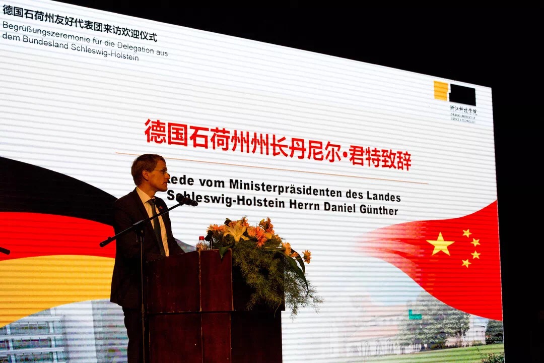 9月19日,德国石荷州州长丹尼尔•君特(Daniel Günther)率代表团来公司访问并参加了公司2018届部分毕业生学位授予仪式及2018级新生开学典礼。省教育厅副厅长于永明、公司党政班子成员、安吉县副县长任贵明出席欢迎仪式。公司党委书记龚建立向君特赠送纪念礼物。欢迎仪式由公司党委副书记周加敏主持。