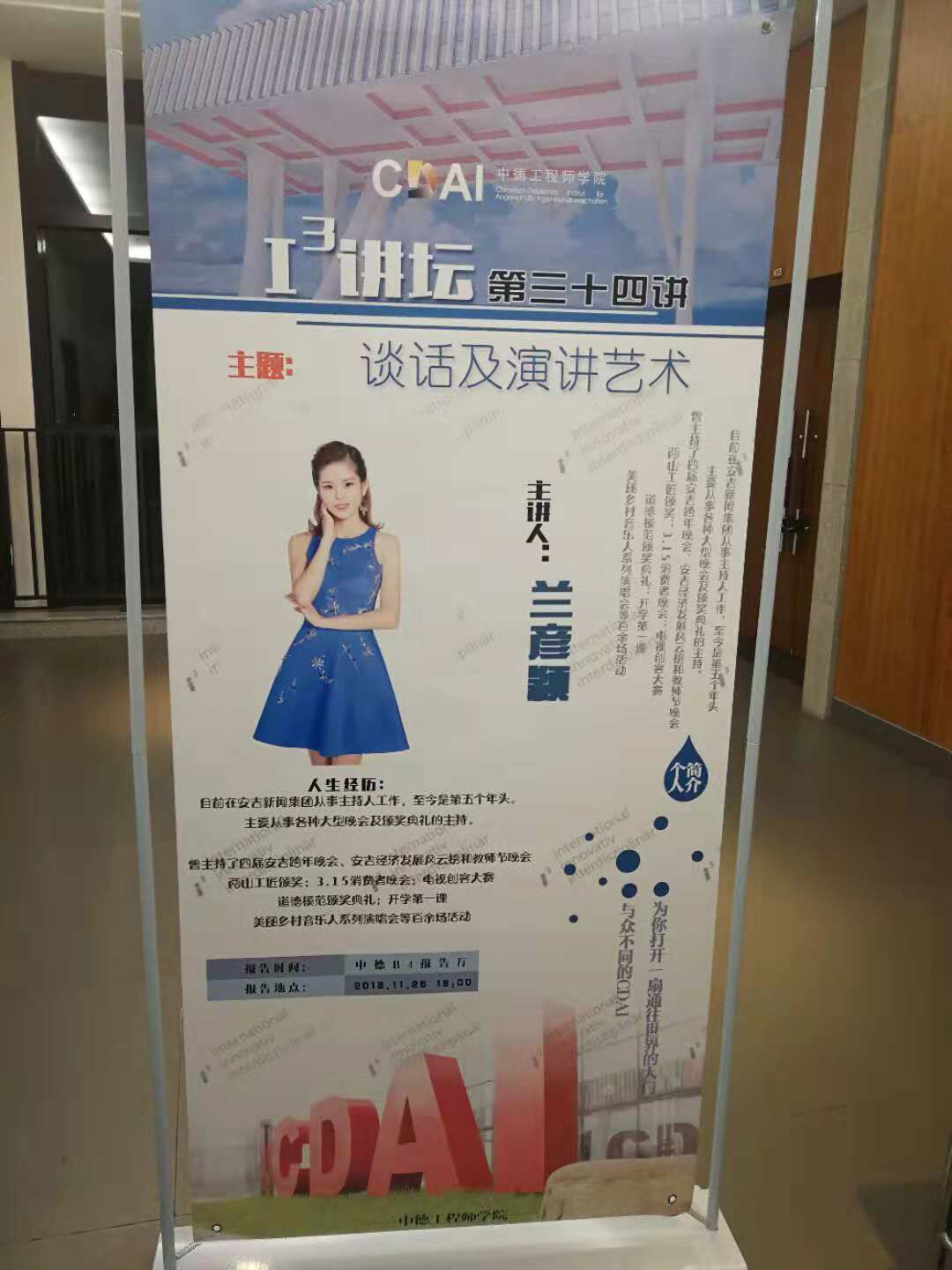 2018年11月26日18:00,永利yl23411官网18级全体同学齐聚中德楼B4报告厅,聆听由安吉新闻集团的主持人兰彦颖带来的主题为“谈话及演讲的艺术”的I³讲坛。