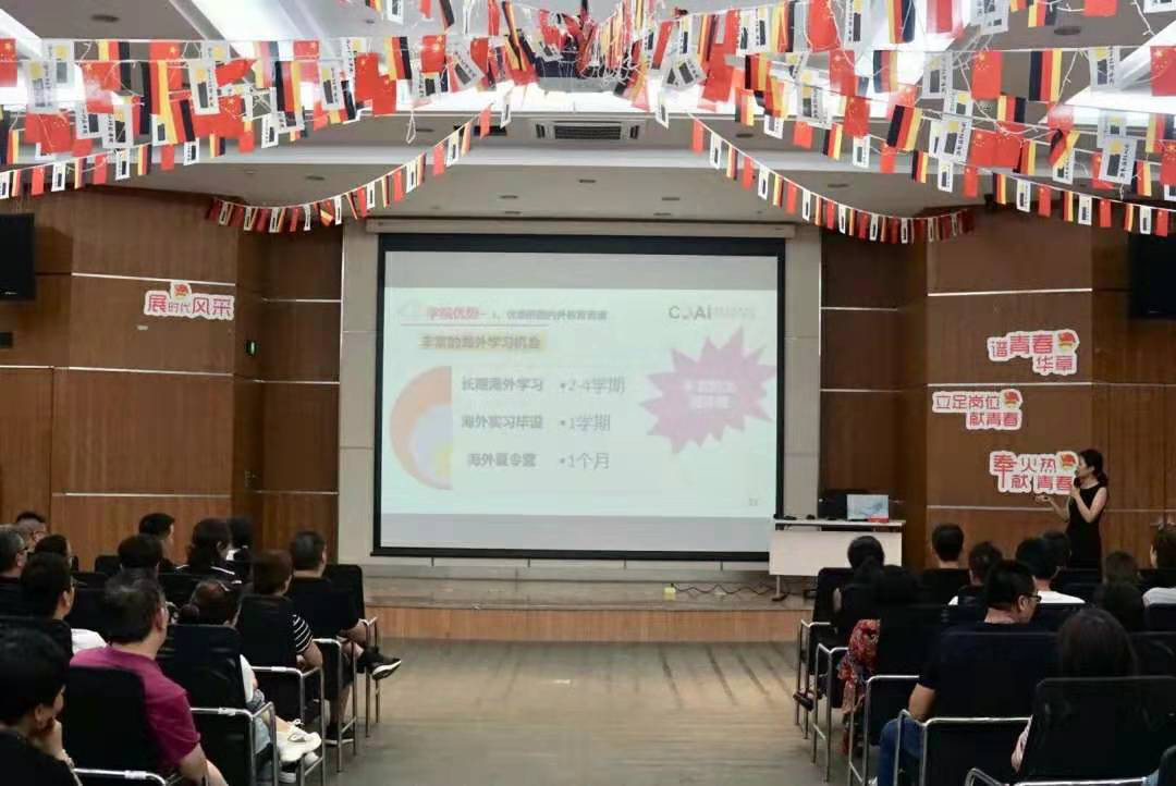 随后,在中德楼教室里,张云莲老师和范佳静老师分别向土木专业和电气专业的同学们以及家长们介绍了课程设置、团队力量、合作院校、毕业实习以及就业前景等方面内容,突出了公司的国际化办学特色。两位老师耐心热情地为同学和家长答疑解惑,家长们也对公司有了初步了解,并对公司优质的教学模式,丰富的教学资源以及规范性、示范性、国际性为一体的合作给予了高度认可。