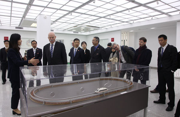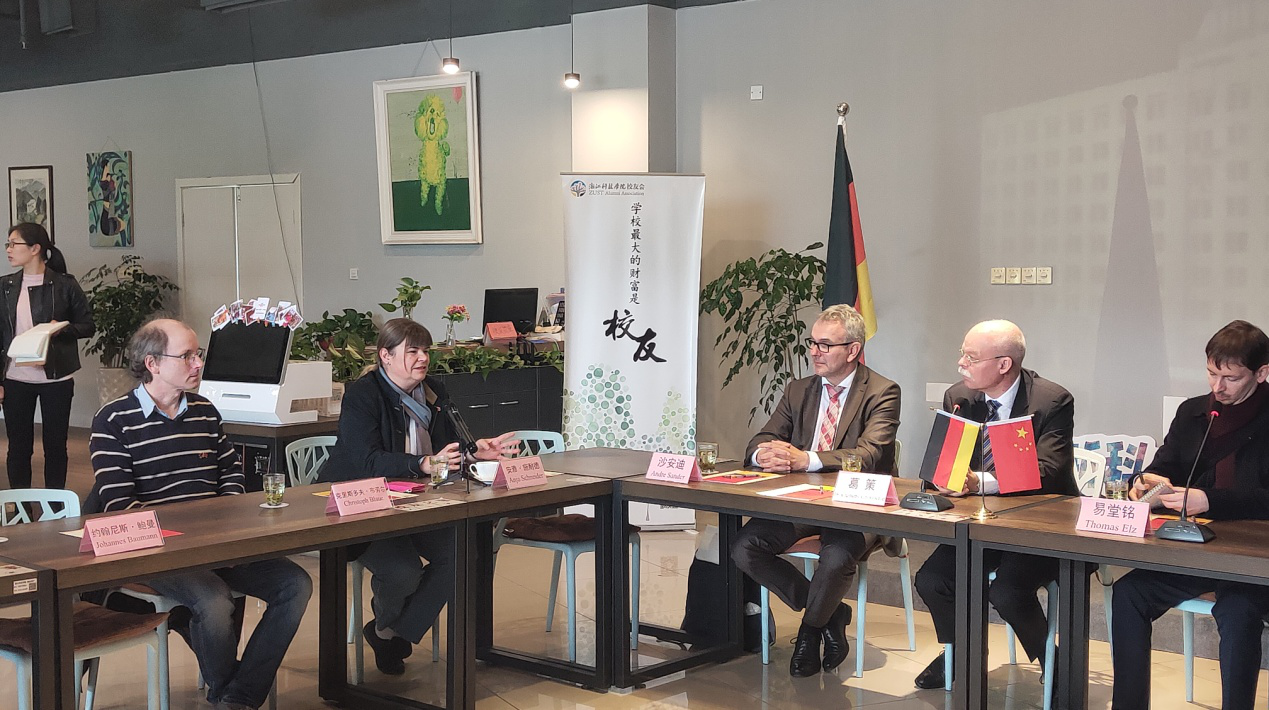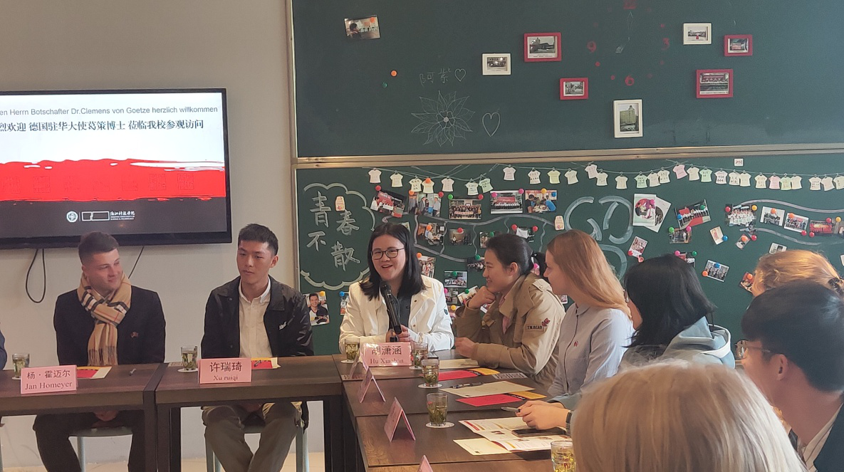 葛策一行在公司德语教师的介绍下参观了校中德合作馆,随后与德籍教师、德国项目员工及德国职工代表在员工之家进行座谈。公司德籍教师克里斯多夫·布劳尔教授、安雅·施耐德女士、16级员工胡潇涵、张益妍、许瑞琦、德国职工雅各布·里巴特等参与了座谈,并与葛策大使进行了亲切深入的交流。葛策询问了员工们的学习情况和未来发展的打算,中国员工们向葛策阐述了自己参与德国项目的初衷与体会,德国职工及德籍教师表达了在中国学习与任教的积极感受。最后,葛策一行与师生代表进行了合影留念。