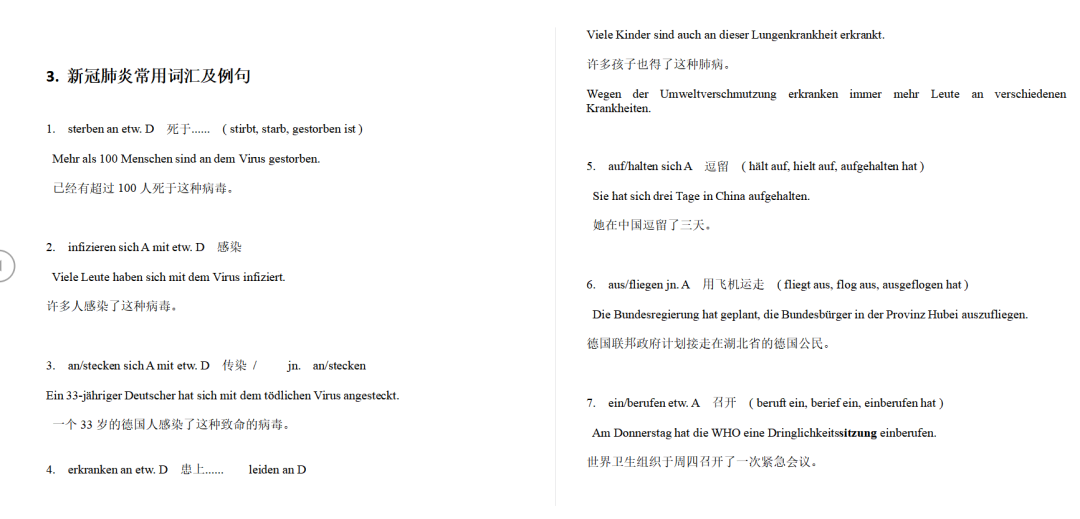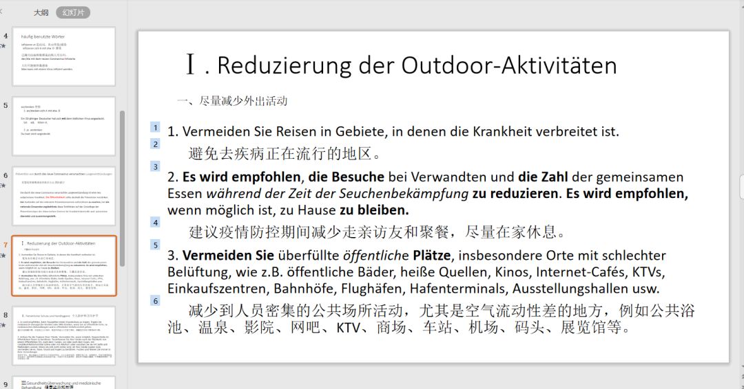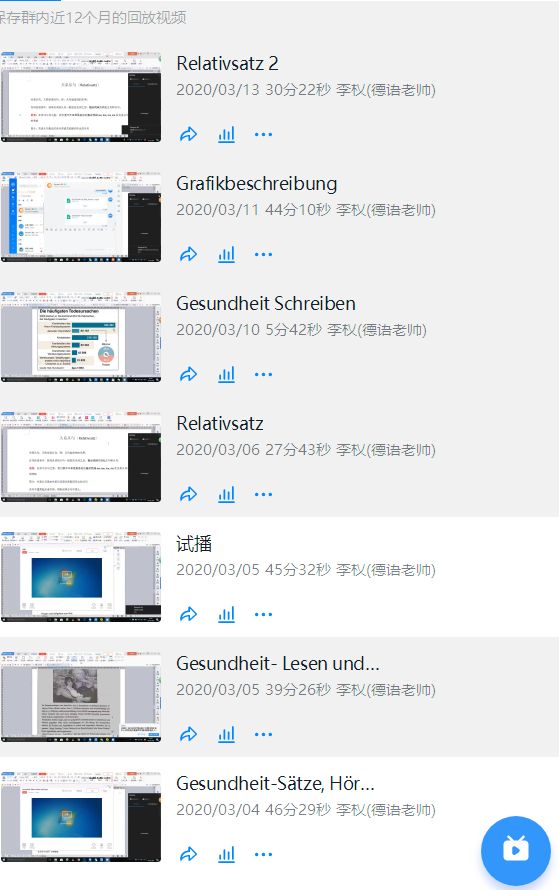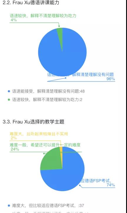 教学环节主要是从词汇认识、阅读理解、语法补充、观点表达以及图表描述等方面展开,部分德语练习也会按照德语确认考的要求和题型进行训练。教师通过直播以及共享资料提供该主题的词汇、科普文章、报刊文摘等,以此在课堂上提高线上参与者对该主题听力、阅读的理解,对词汇的运用,对该主题阐述介绍以及表达自己观点的能力。