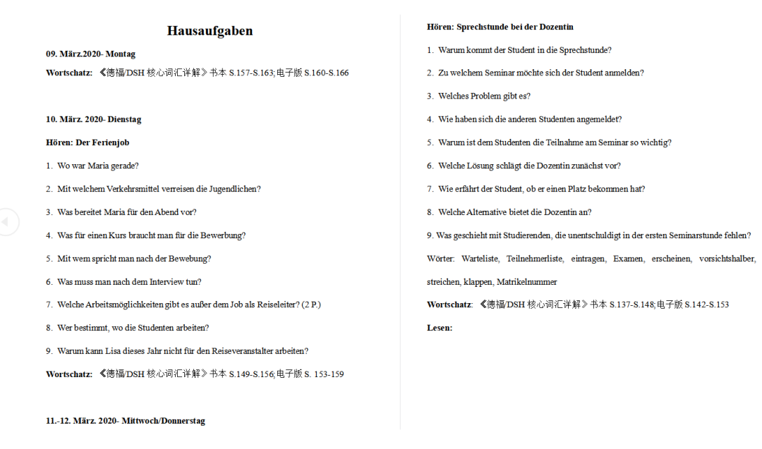 摆脱传统的课本教材,以提升交际会话能力和达到德语确认考要求的语言水平为教学目标,教师整合一套以电子文档、视频教学为主的符合B2德语语言水平的线上教材。