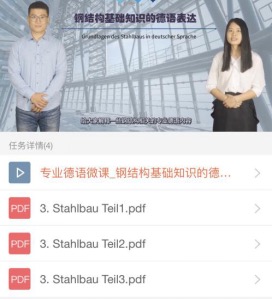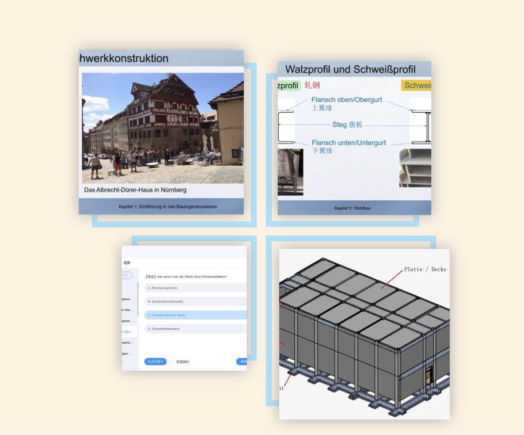该课程是针对永利yl23411官网土木工程专业大二下学期与大三上学期的员工开设的必修课,教学内容整合了土木工程的各门专业课知识(专业德语I的内容侧重钢结构、混凝土结构、桥梁工程等结构课程,专业德语II的内容侧重水、施工及建筑法规等),采用中德双语授课,目的是让员工掌握土木工程专业相关德语表达,以达到能听懂德语授课的专业课及阅读德语专业文献的目的。