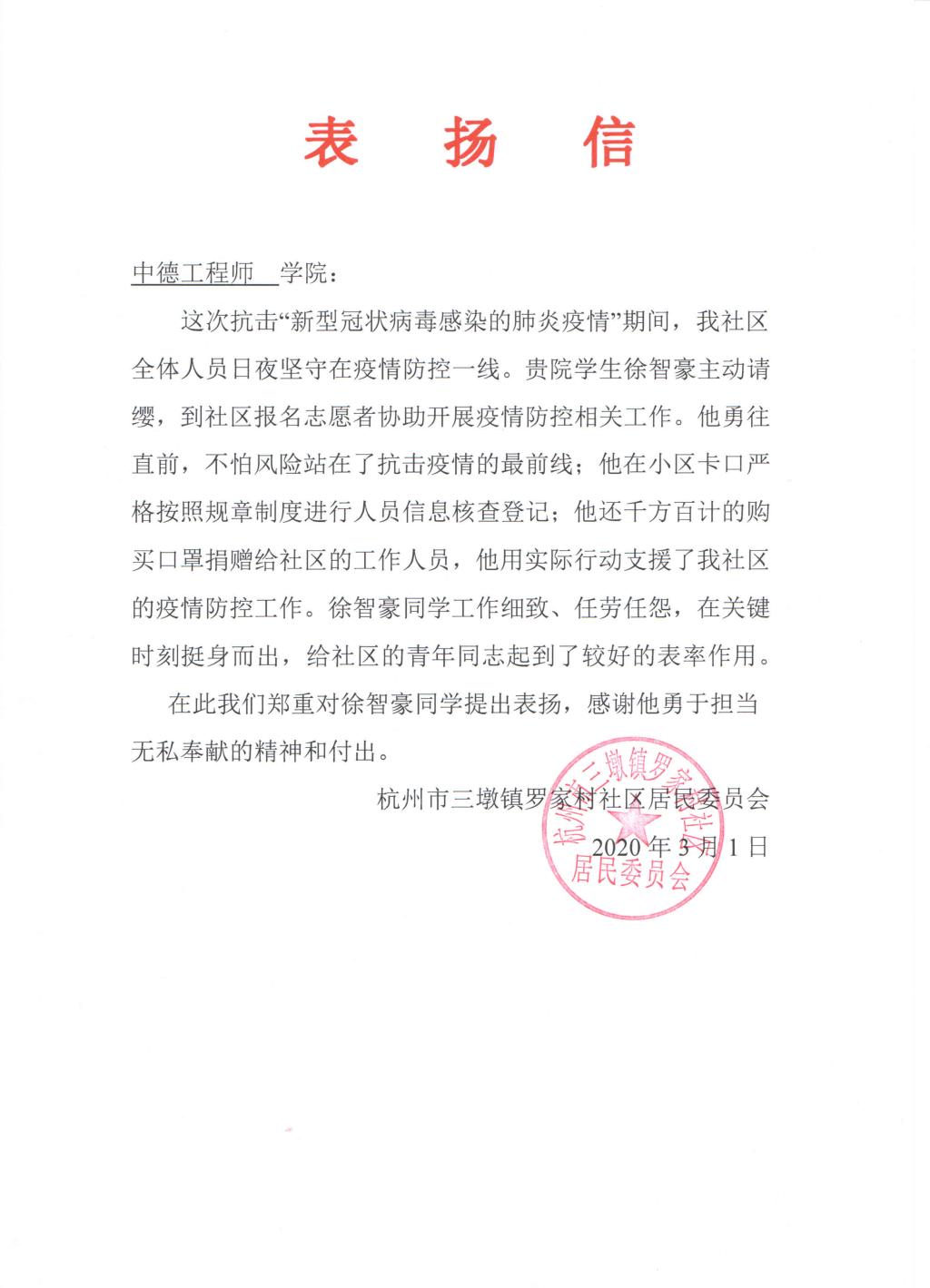 近期,公司收到了来自杭州市三墩镇罗家村社区居民委员会的表扬信,信中对公司17级电气工程及其自动化专业学子、员工会副主席徐智豪同学提出表扬,对其在疫情期间勇于担当无私奉献的精神给予高度肯定。
