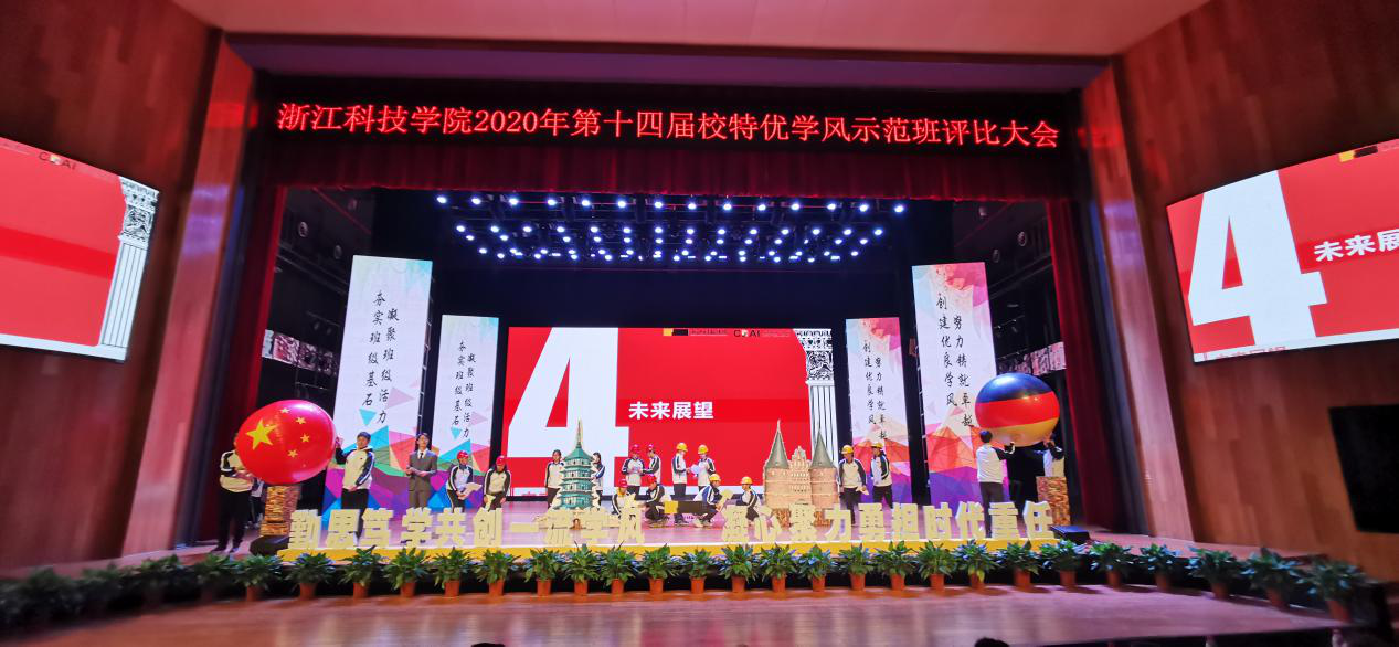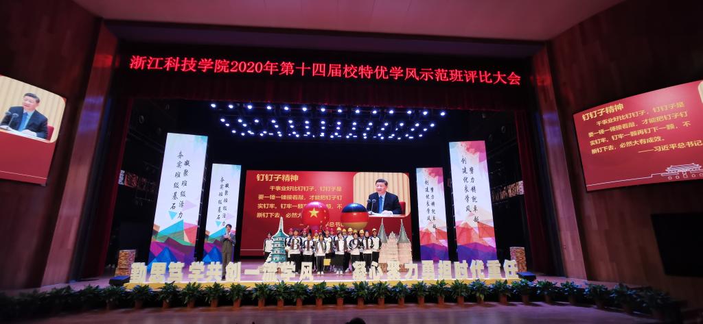 2020121418:30,浙江科技公司第十四届校特优学风示范班评选在小和山水晶剧院进行。公司参评班级19土木一班经过自评、督导组听课、网络投票、现场展示等环节层层PK,最终从18个班级中脱颖而出,作为唯一大二班级荣获“校特优学风示范班”称号。