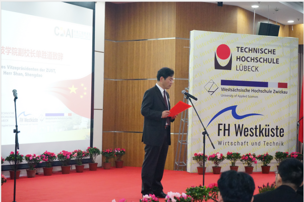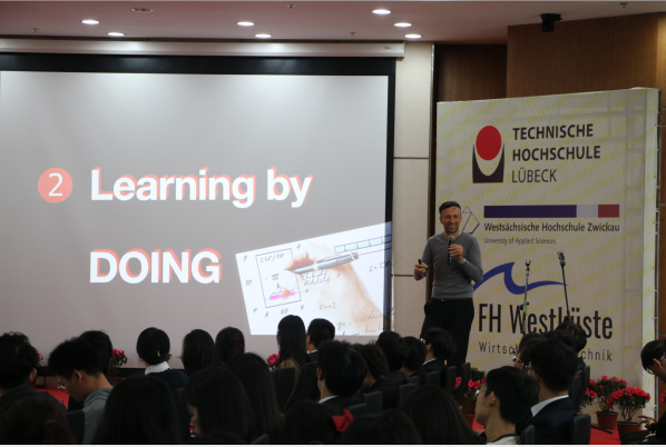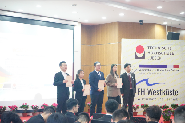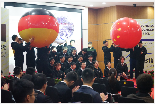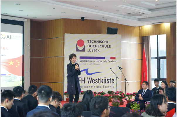 典礼在公司薛文副经理与教学经理坎普教授的共同致辞中拉开了帷幕。典礼第一幕为“喜迎新生”。首先,单董事长介绍了公司的特色与优势,并向新生们表达了热烈的欢迎与诚挚的祝愿。受疫情影响,吕贝克应用科技大学的Schwartze副董事长和茨维考应用科技大学的Schumann教授未能来到典礼现场,他们通过视频的形式向新生表达了最真挚的问候。