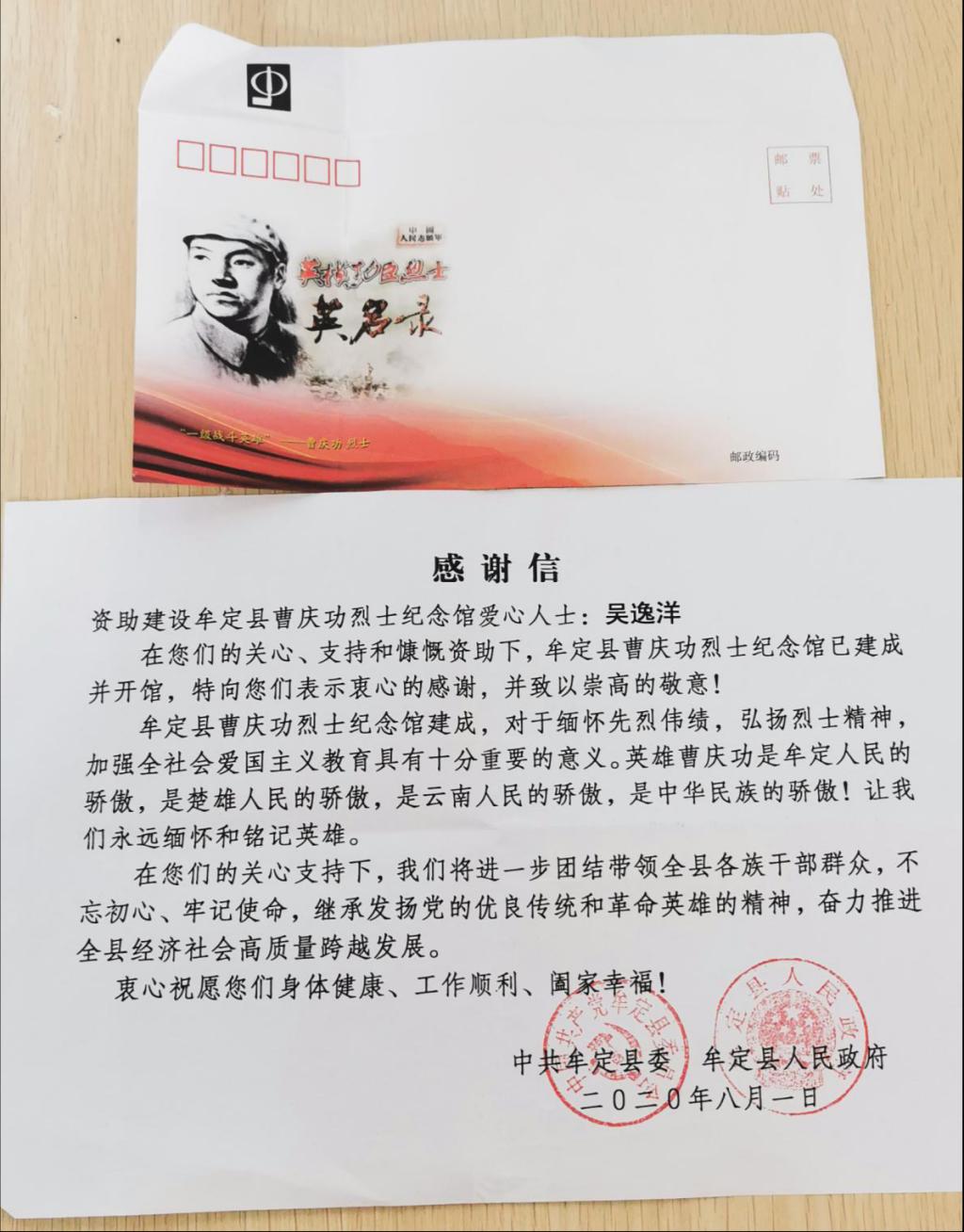 近期公司收到一封来自中共牟定县委、牟定县人民政府发来的感谢信,感谢公司18级土木专业吴逸洋同学为曹庆功烈士纪念馆建设给予的关心、支持和慷慨资助。