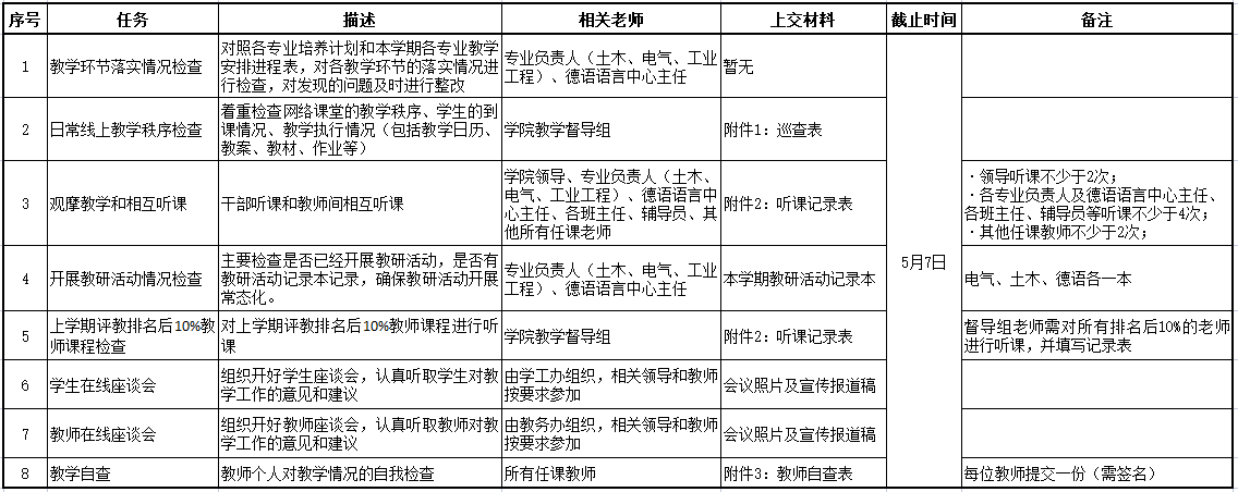 集团定于第9周、第10周(4月18日~4月30日)进行期中教学检查。现将公司期中教学检查任务分配如下表,请老师们按要求及时完成任务并将相关材料电子版发送至eam.cdai@outlook.com