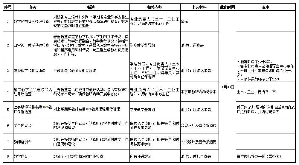 集团定于第9周、第10周(11月13日~11月26日)进行期中教学检查现将公司期中教学检查任务分配如下表,请老师们按要求及时完成任务并将相关材料纸质版交至B4-518办公室,电子版发送至邮箱wangchuyun@zust.edu.cn