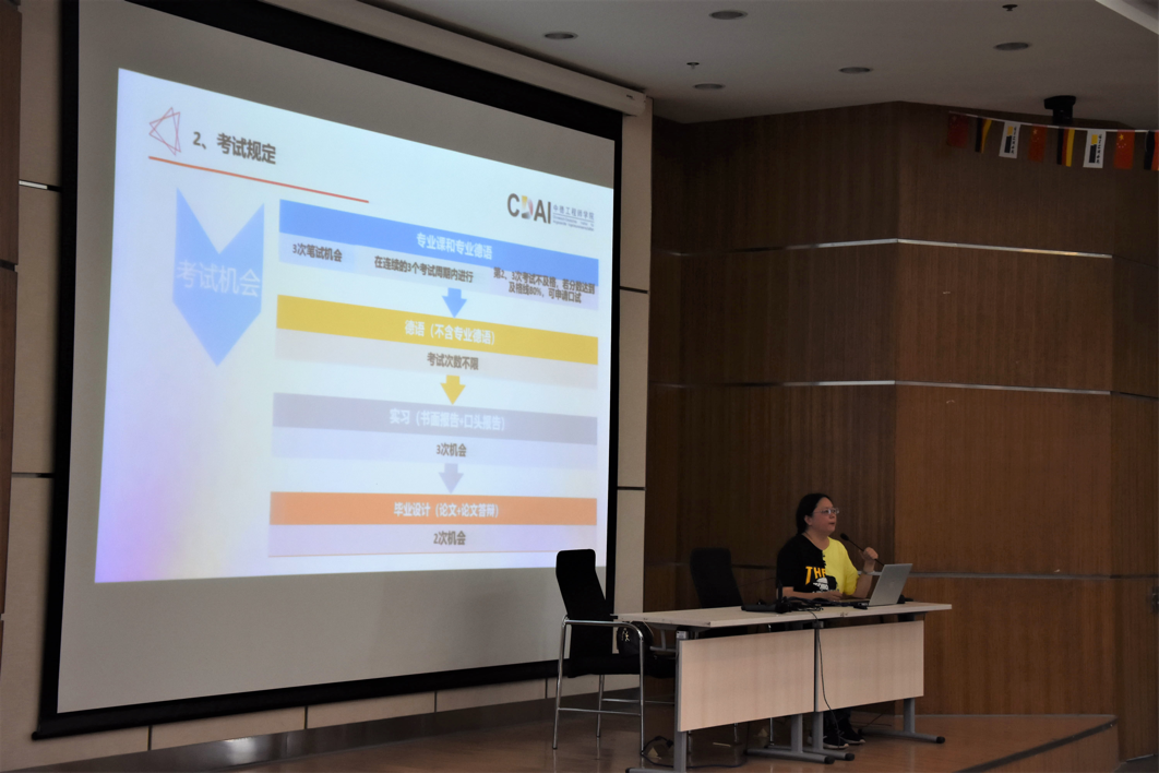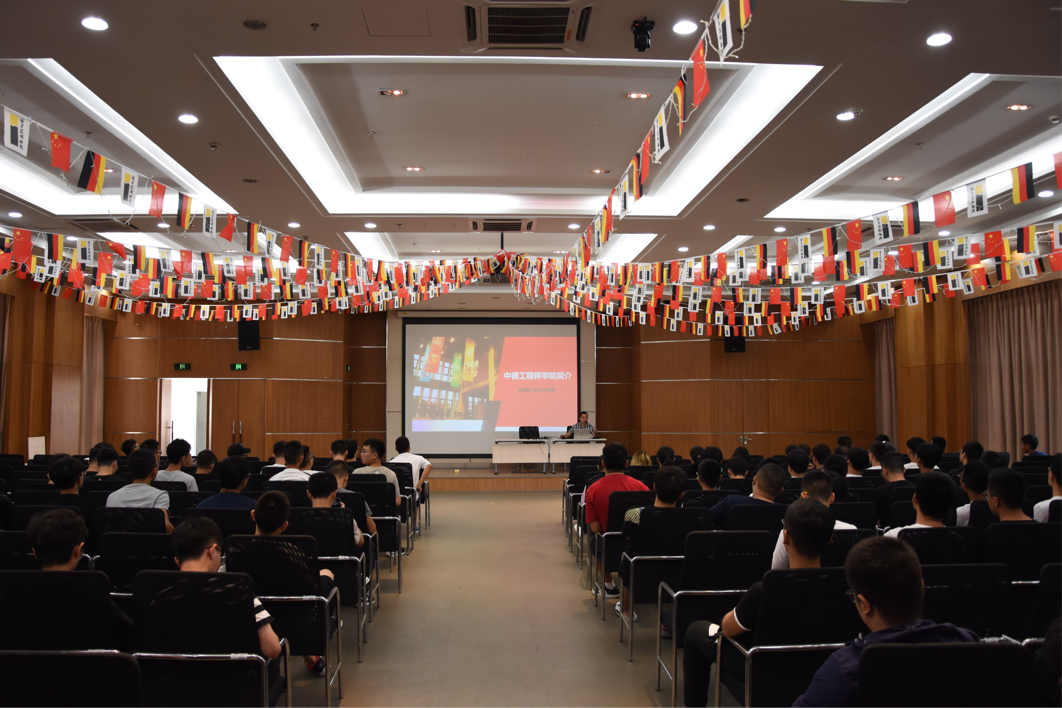 首先李成炜老师从公司独特的中德合作性质出发,从媒体关注、海内外教育资源、团队力量及德国模式的教学与管理体系几点面向2018级新生进行概况介绍,使同学们对于公司加深了认识。随后带来的学工线专题报告中,李成炜老师详细介绍了公司员工守则、生活指导、发展规划和奖学金机制四大方面,强调了公司在人才培养上的一系列帮扶举措,鼓励员工增强自律意识以及自我规划能力,珍惜大学宝贵时光。直属党支部副书记范佳静老师作为教务负责人介绍了课程设置、考试规范、出国选拔、预备实习与实习和学位指导等内容,认为在特有的考试机制下,作为中德工程公司学子,应努力完成各项任务,不应浪费每一次机会,成为更优秀的人。