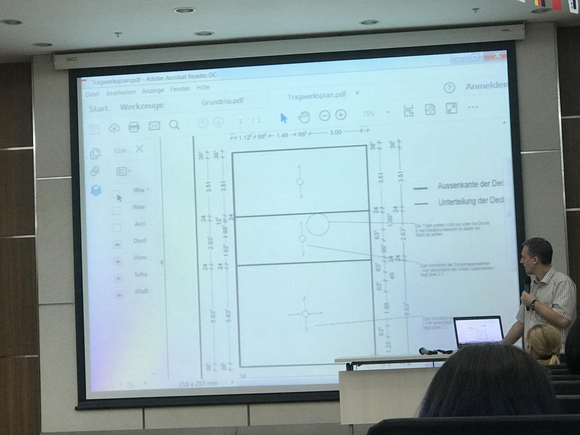 此外,Jungwirth教授还给同学们做了以桥梁工程为主的专题报告,介绍了不同国家的工程项目,其中有北京-上海铁路线上的南京长江大桥设计、杭州-长沙铁路线上的无砟轨道设计、多哈地铁线上的桥梁设计及已有桥梁的维修与加固、毛里求斯的斜拉索桥设计、建筑信息模型在教学上的应用等。教授以桥梁的实际工程为例跟员工强调,对于结构设计,要根据不同国家的国情来进行。