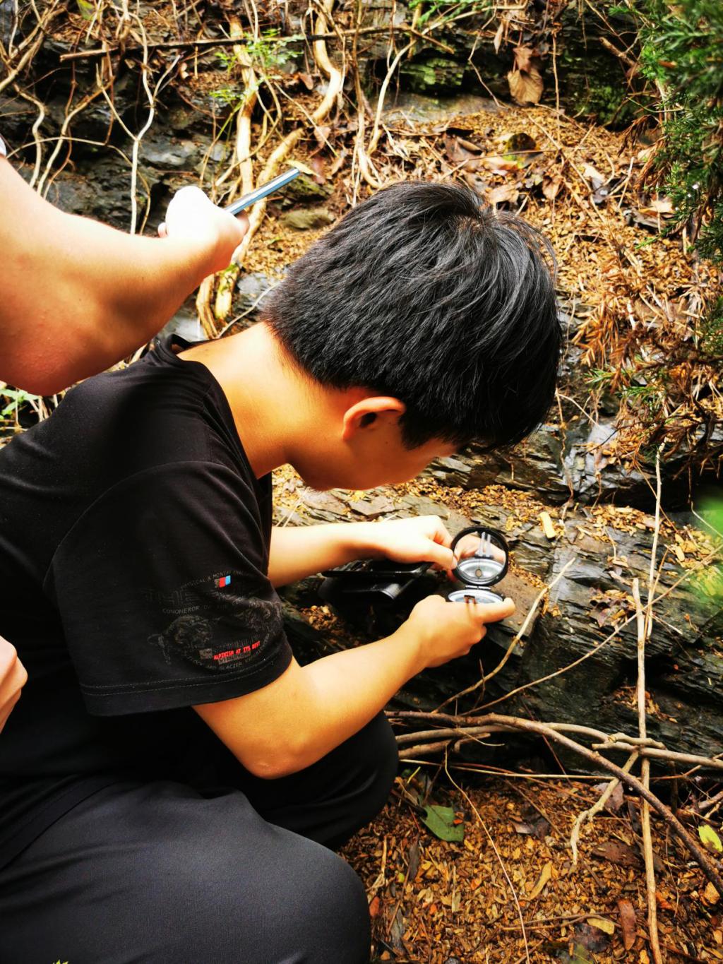 在习得园大家认真参观了陈列柜里的岩石和矿物标本。曹老师提醒同学们结合书本分类标准对标本形状进行对照,帮助大家加深对不同种类的岩石、矿物特征的印象。在精艺园曹老师带领同学们先是通过工程地质罗盘仪对岩层进行初步测量,随后用精密的电子智能罗盘进行检验,最后敲击岩层对新鲜岩面进行观察分析来确定岩性。活动中大家兴致盎然,不断向老师请教。曹宇春老师希望大家不断加强理论学习、将理论与实践相结合,在工程地质学科有所作为。