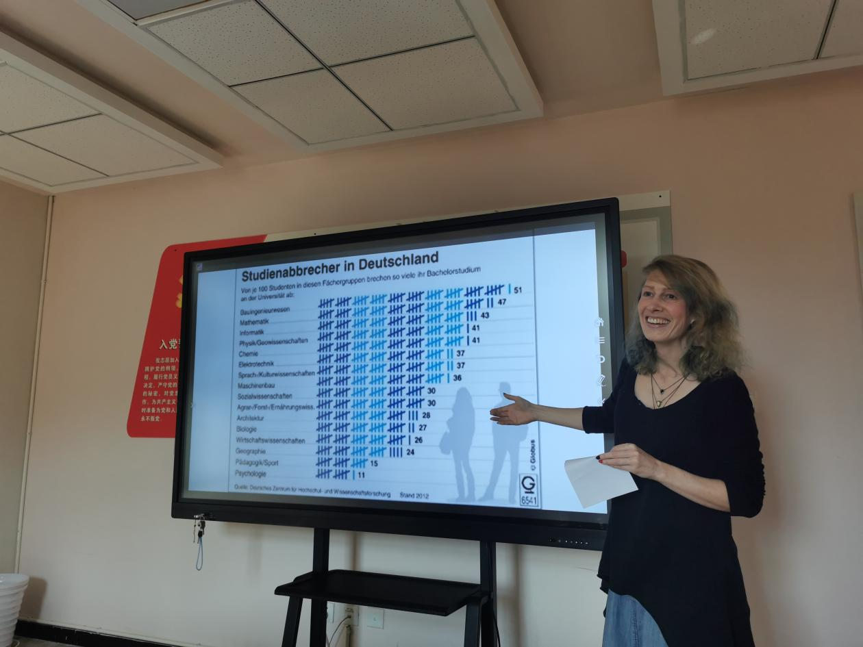 11月10月,“走向世界”辅导员工作室举办交流沙龙,公司德语教师Mara Gröner做主题分享,来自学工、教学、教务各条线教职工参加。Mara为柏林自由大学硕士,歌德公司认证德语教师,曾在德国柏林的多家语言公司任教,来华之后曾就职于成都大学,2021年起在永利yl23411官网工作。