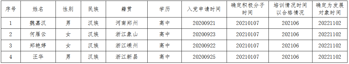 经党支部培养教育和考察,在听取培养联系人、党员和群众意见的基础上,经支部委员会讨论同意并报上级党委备案,拟于近期讨论接收魏嘉汉等4位同志为中共预备党员,现将有关情况公示如下: