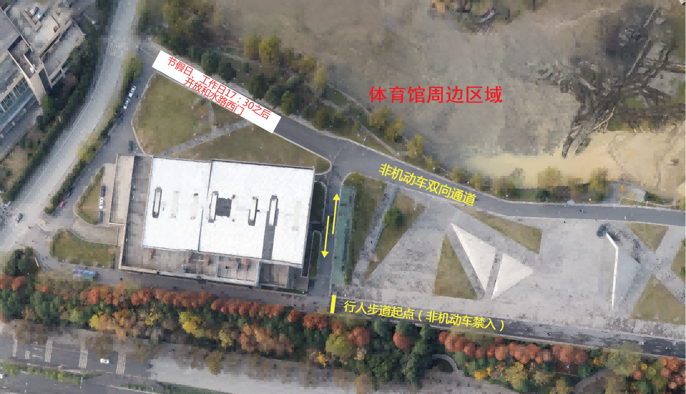 1.对体育馆、水晶剧场、行政楼周边道路实行人车分流、机非分道管控措施,机动车辆、非机动车辆按照交通标示牌及路面指示标志通行(具体通行路线详见附图),机动车一律停在车位线内。