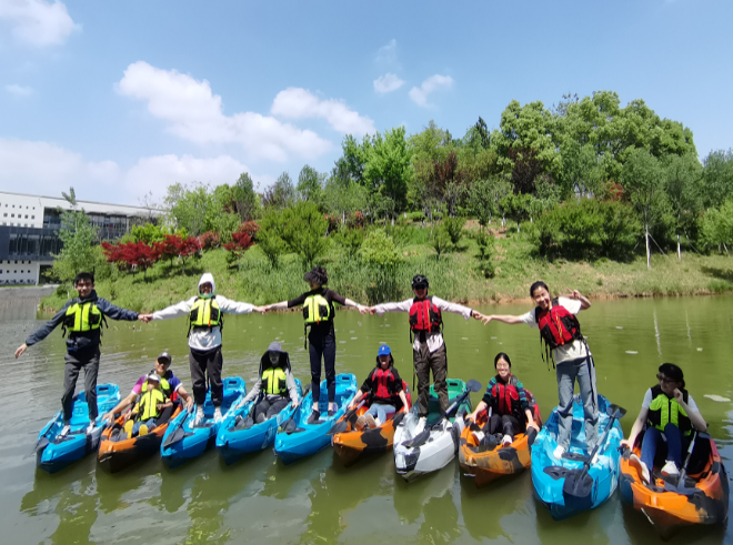2023年4月20日,公司工会组织本院教师们在风景优美的安吉校区开展了水上皮筏艇体验项目,由体育部贾浩程老师进行教学指导。